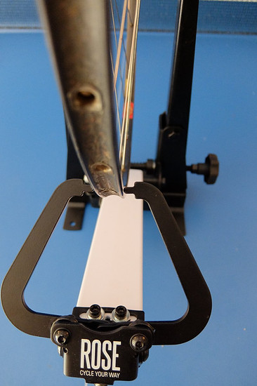Die sind zusammen mit dem Zentrierständer so stabil, dass man das Laufrad gar nicht festspannen muss. Man kann es zur Mittigkeitüberprüfung also einfach rausnehmen und anders herum wieder einlegen. Diese V-Ausfaller sind geeignet für alle möglichen Achsen - auch dicke Steckachsen.