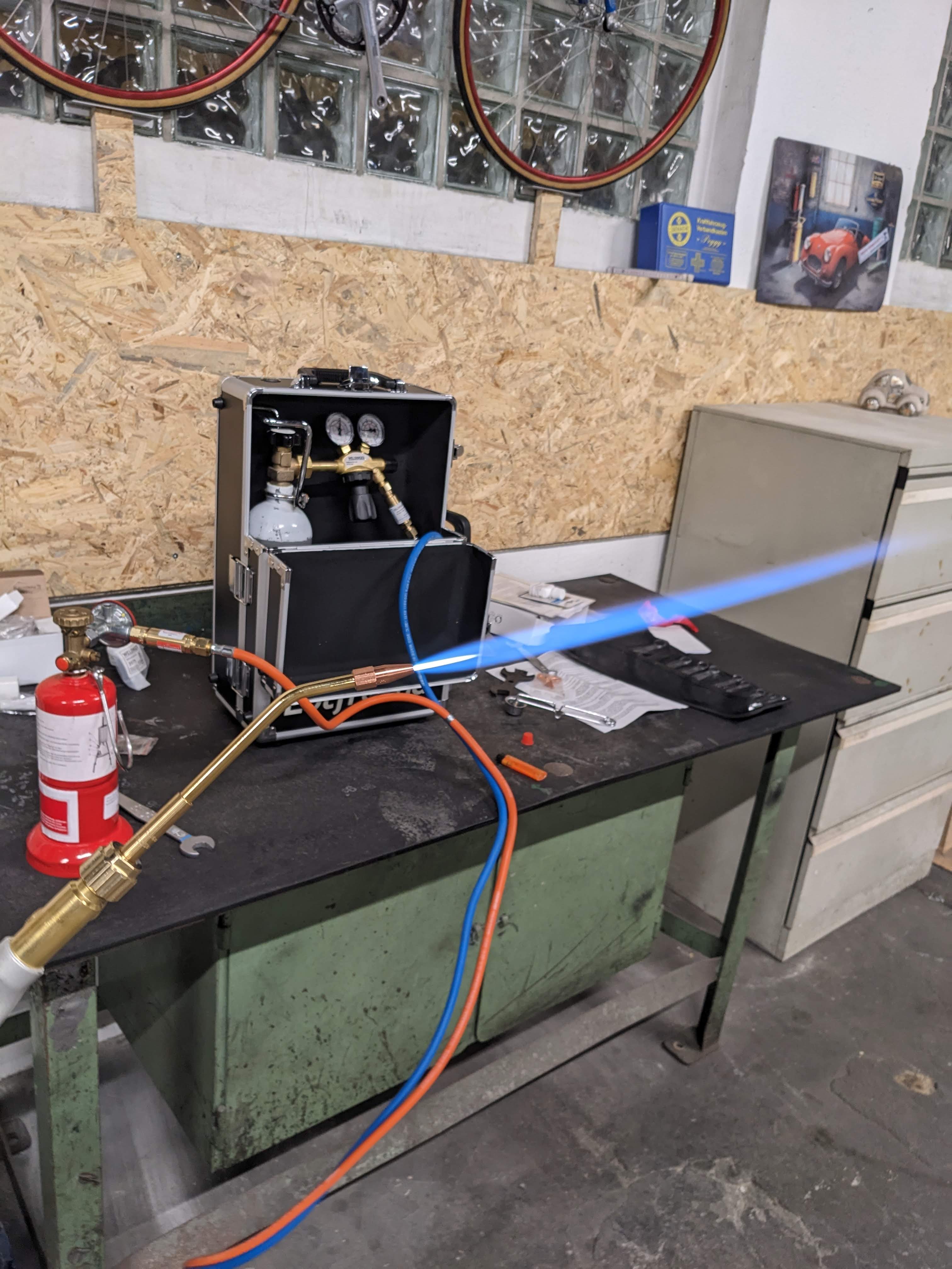 Und da sind wir beim zentralen Gerät des Unterfangens. Mir wurde gesagt “Kriegst du günstig gebraucht”. Ich habe gesucht, aber eigentlich nix gefunden, was mir zusagte. Ich wollte keine Riesenflaschen und ich wollte kein Acetylen, sondern Propan. Gefunden habe ich (oft abgelaufene) Riesenflaschen Acetylen und Sauerstoff, uralte Schlauchkits, Brennergarnituren mit (für Propan überflüssigem) Schweissbrenner und grossen oder falschen Düsen, etc..
