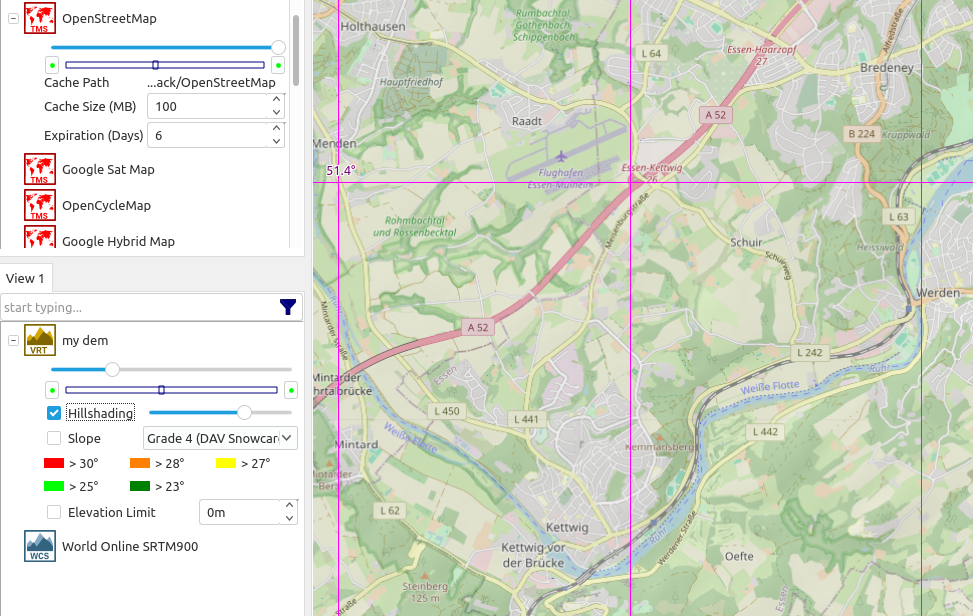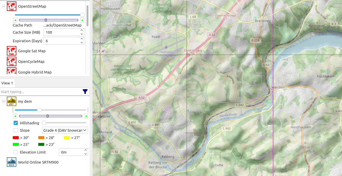 Ganz ähnlich funktioniert Hillshading. Wir aktivieren NUR die Strassenkarte und die DEM Daten.