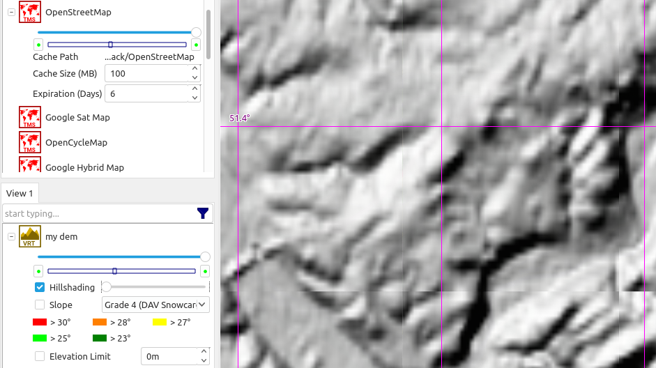 Mit dem Regler rechts neben dem Hillshading-Haken kann man den Kontrast der Daten einstellen. Zwischen sehr “wolking” und einem weichen Grauschleier.